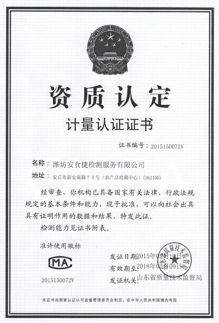 2015年2月,魯豐集團組建的第三方檢測中心——濰坊安食捷檢測服務(wù)有限公司獲省質(zhì)監(jiān)局計量認證,是該公司繼中國合格評定認可委員CNAS認可后的榮獲的又一資質(zhì)。
