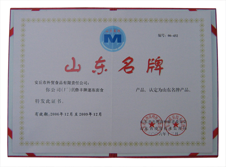 公司生產(chǎn)的"魯豐"牌速凍面食產(chǎn)品榮獲"山東名牌產(chǎn)品"稱號!