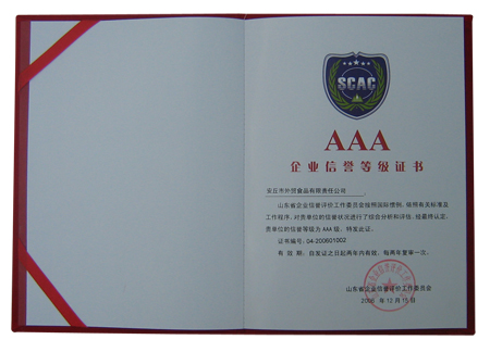 公司被山東省企業(yè)信譽評價工作委員會評為山東省AAA級信譽企業(yè)